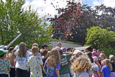 Mit Konfetti-Regen und Eis wurde der Bauspielplatz in Volmarstein eröffnet. 300 Kinder haben schon jetzt eine Menge Spaß und die ersten Buden stehen schon. Auch 30 Kinder mit Unterstützungsbedarf aus unserer Stiftung sind mit dabei. In den nächsten Wochen wächst die Budenstadt hinter dem Berufsbildungswerk.