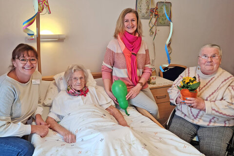 Foto: Die Mitarbeiterinnen Beate Roth (li.) und Rita Berends sowie Herma Makosch vom Bewohnerbeirat gratulierten Clara Kumpmann zum 102. Geburtstag.