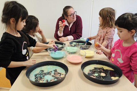 „Oh… guck mal die tollen Farben!“ Die fünfjährige Zoe staunt nicht schlecht, dass sie mit der bunt gefärbten Milch kleine farbige „Planten“ machen kann. Im Forscherraum experimentieren die Kinder mit ihrer Erzieherin Verena Engel. Mit Pipetten ziehen sie die farbige Milch auf und tröpfeln sie dann vorsichtig in das flache Gefäß mit Öl. „Es ist wichtig, dass die Kinder eigene Erfahrungen machen“, weiß die Erzieherin. „Die chemische Reaktion zwischen unterschiedlichen Flüssigkeiten lernen sie so spielerisch.“
