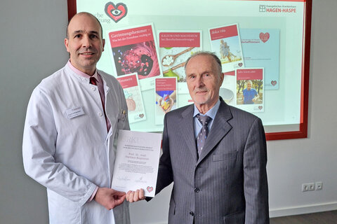 Foto: Professor Dr. med. Harilaos Bogossian, Chefarzt der der Klinik für Kardiologie und Rhythmologie im Ev. Krankenhaus Hagen-Haspe und Dr.-Ing. Heinrich Schulze, ehrenamtlicher Beauftragter der Deutschen Herzstiftung.
