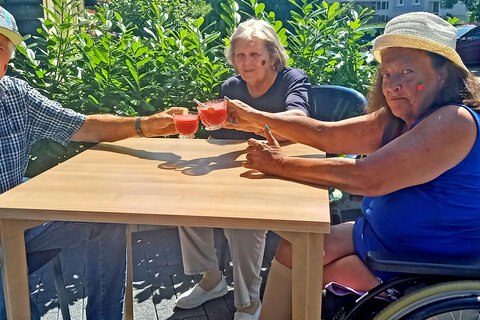 Natürlich durfte auch ein passendes Getränk nicht fehlen – die fruchtige Erdbeerbowle war an diesem warmen Tag besonders beliebt. Für die richtige Stimmung sorgten liebevoll gestaltete Dekorationen rund um das Thema Erdbeere. Ob Erdbeer-Girlanden, Servietten in Beerentönen oder kleine Deko-Erdbeeren auf den Tischen – die Tagespflege verwandelte sich in ein kleines Erdbeerparadies.