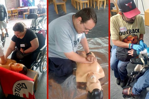 Ziel war es, Beschäftigten den Zugang zu lebenswichtigen Erste-Hilfe-Kenntnissen zu erleichtern – verständlich, praxisnah und ohne komplizierte Fachsprache. Dafür wurden die Dozent*innen eigens geschult, um Erste Hilfe in einfacher Sprache zu vermitteln. Dank der Unterstützung durch Aktion Mensch konnten zudem alle Materialien beschafft und eine eigene Lehrunterlage in leichter Sprache erstellt werden.