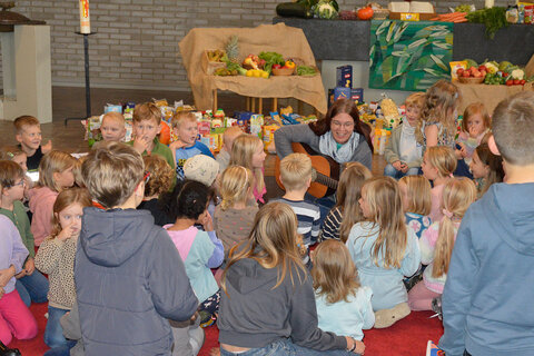 Großes Gewusel im Altarraum der Martinskirche: Mädchen und Jungen aus den drei Stiftungs-Kindertagestätten Pusteblume, Bullerbü und Wilhelminen feierten einen fröhlichen Erntedank-Gottesdienst. Dazu gehörte u.a. gemeinsames Singen nach der Gitarren-Musik von Lichtburg-Mitarbeiterin Soja Meiwis. Warum gibt es Erntedank? Welche Bedeutung hat das Teilen? Mit solchen Fragen hatten sich die Mädchen und Jungen in den vergangenen Wochen beschäftigt. Und mit Unterstützung ihrer Eltern sammelten sie fleißig Lebensmittel, die sie im Altarraum präsentierten und anschließend dem Wetteraner Brotkorb übergaben. Auch die Kita Hegestraße hatte sich an der Sammelaktion beteiligt.