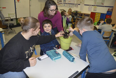 Woraus besteht eine Pflanze? Die Schülerinnen und Schüler der Oberlinschule wollen es genau wissen. Mit spitzen Fingern und scharfem Messer zerlegen sie eine Blume in Wurzel, Stiel und Blüte. Dabei sitzen sie in Kleingruppen an Tischen und schreiben die richtige Bezeichnung der einzelnen Pflanzenteile in Großbuchstaben auf einen Zettel. Mittendrin ist Celia Maria Willkommen (13), eine Konfirmandin der Ev. Kirchengemeinde Herdecke-Ende.