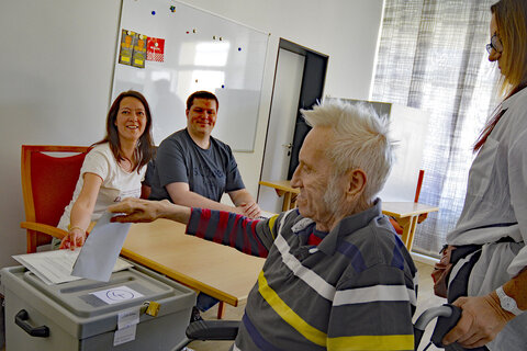 „Zur Inklusion gehört auch politische Teilhabe“, sagt Monique Voetzsch, Leiterin des Sozialdienstes auf der Vitus-Höhe. Sie und ihre Kolleginnen haben deshalb die Bewohnerinnen und Bewohner bei der Wahrnehmung ihres Wahlrechts unterstützt – entweder vorab bei der Briefwahl oder beim sonntäglichen Besuch des Wahllokals direkt gegenüber der Einrichtung. „Ich habe immer gewählt, das ist doch eine Art Bürgerpflicht“, meinte der 80-jährige Reinhard Jaeger, als er in seinem Rollstuhl ins Wahllokal gefahren wurde.