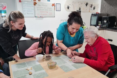 „Ich teile mit dir“, sagt die kleine Marta und reicht der Seniorin neben ihr mit einem strahlenden Lächeln die bunten Streusel. Plätzchen backen und verzieren genossen Alt und Jung im Wohnprojekt Wilhelminengarten.
