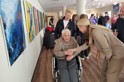 Foto: Dr. Katja Strauss-Köster begrüßt den kunstinteressierten Bewohner Gerd Hasbargen, begleitet von seiner Tochter Gerda Elberfeld.