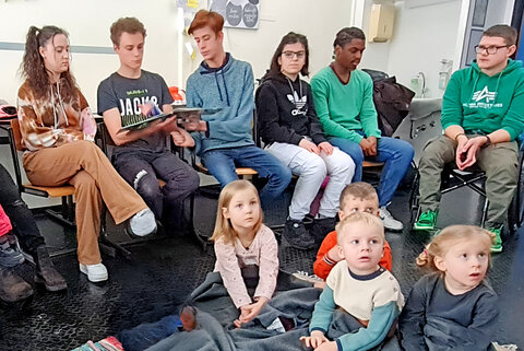 „Ich liebe Bücher“, sagt Mahi Abbas. Die 20-Jährige ist regelmäßig in der Leselounge der Schule und leiht sich Bücher aus. Damit ist sie schon fast die Ausnahme in der Klasse. Denn ihre Mitschüler*innen lesen eher im Internet – mal Nachrichten oder Beiträge in den Sozialen Medien. Den Kindern laut vorzulesen, ist für alle eine neue Erfahrung. „Das macht Spaß“, sagt der 19-jährige Lucas Boldt, der sich wie alle die gemeinsame Lesezeit genießt. „Lesen verbindet! Wir freuen uns sehr, dass aus der Idee zum bundesweiten Vorlesetag im November 2023 nun eine langfristige Lesekooperation mit der KiTa Bullerbü entstanden ist, die alle Schüler*innen in die Welt des (Vor-)Lesens mitnimmt!“, betont Nicola Tiggemann-Koch, Lehrerin am Berufskolleg der Ev. Stiftung Volmarstein.