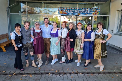 Foto: Zünftig in Dirndl und Lederhosen feierte das Team von Haus Berchum das Jubiläum gemeinsam mit der Bewohnerschaft und den Gästen.