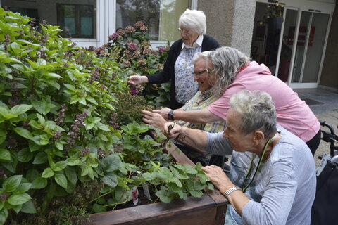Im Frühjahr hatten sie damit begonnen: Sie pflanzten Kräuter, setzten Erdbeerpflanzen ein und auch Triebe vom Pflücksalat. Weil das Beet auf stabilen hohen Beinen steht, können ältere Menschen darin problemlos mit Rollator oder im Rollstuhl arbeiten.