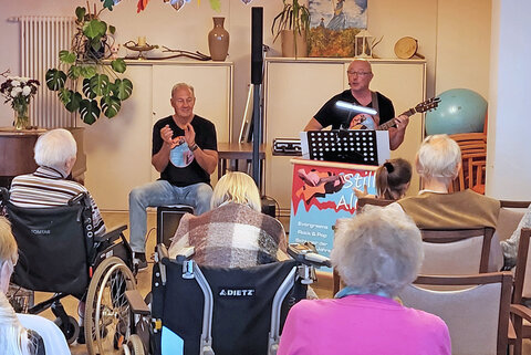 Neues und Abwechslung halten jung – nicht nur die Musiker selbst, sondern auch die „Fans“ in den Senioreneinrichtungen. Daher bieten Sarah Meining und das Team des Sozialen Dienstes in der Senioreneinrichtung der Ev. Stiftung Volmarstein für die Bewohnerschaft einen bunt gefüllten Wochenplan mit Freizeitaktivitäten. „Hier wird viel gelacht“, betont die Fachkraft. „Humor ist doch das Salz des Alltags.“ Kein Wunder also, dass am Ende des Konzerts lautstark Zugabe gefordert wurde. Und das Duo ließ sich nicht lange bitten und bot noch einen Hit von Udo Jürgens: „Dass der Herrgott den Weg in den Himmel mir bahne…aber bitte mit Sahne!“