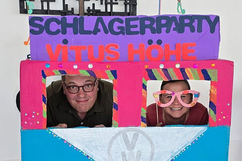 Bereits im Vorfeld hatte das Team der Vitus-Höhe gemeinsam mit den Bewohnerinnen und Bewohnern für das passende Ambiente gesorgt: Bunte Dekoration, selbstgebastelte Accessoires und ein ganz besonderes Highlight – ein originalgetreuer VW-Bus aus Pappe, der als Fotobox diente und für jede Menge Spaß sorgte.
