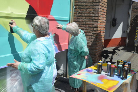 Foto1: Mit Spraydosen am Werk: Gäste der Tagespflege Wiesenviertel als Graffiti-Künstler.