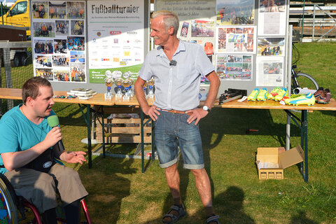 Foto: Werner Walther (rechts) bei der Eröffnung eines inklusiven Fußballturniers auf dem Sportplatz Schöllinger Feld, das er regelmäßig organisierte.