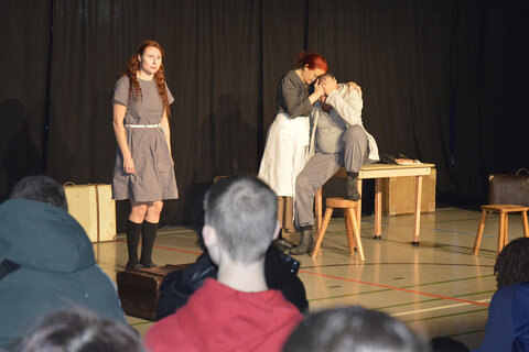 Foto: Mit großem Interesse verfolgten die Schülerinnen und Schüler des Werner Richard-Berufskollegs das Theaterstück „Über das Leben oder meine Geburtstage mit dem Führer“.