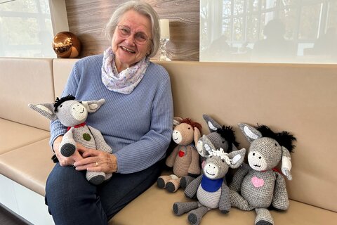 Frau Gruschke, die früher eine eigene Puppenklinik in Witten betrieb, braucht etwa eine Woche für ein Kuscheltier. So kamen in acht Wochen so viele Eselchen zusammen. Begleitet von ihrer Schwester übergab sie die kleine Herde in der Caféteria der Orthopädischen Klinik Volmarstein, was von Gästen und Mitarbeitenden nicht unbemerkt blieb. So ein süßer Besuch löste bei allen ein Strahlen aus.