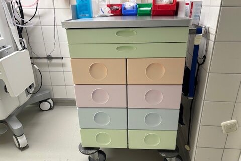 Die alten Schranktüren und Schubladen waren technisch in Ordnung, aber die Lackierung blätterte schon an vielen Stellen ab. Am alten Grün und Orange lässt sich erahnen, wann sie irgendwann mal angeschafft wurden. Aus den Spendenmitteln der Jahreskampagne 2024 - "Keine Angst, kleiner Schatz" wurden während der Schließung der OP-Säle zwischen den Jahren von unseren eigenen Malern frisch lackiert.
