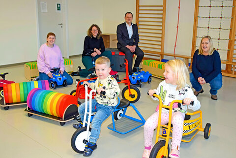 Während draußen ein Wintersturm heult, sausen Max und Leni vergnügt auf den neuen Taxi-Dreirädern durch ihre Kita Blauer Planet in Gevelsberg um die Wette. Marcus Messner und Silke Potent von der Commerzbank Gevelsberg freuen sich über die Begeisterung. Im Namen der Detlef Kramer Stiftung konnten Sie einen Scheck über 2750 Euro überreichen. Von der Spende konnten die vielen Fahrzeuge, Sitzkissen und eine Aufbewahrungsbox angeschafft werden. „Von den 87 Kindern in unserer Kita sind sechs Inklusionskinder, und wir sind auf mehr vorbereitet“, erklärt Einrichtungsleitung Nina Pohlmann. „Die neuen Fahrzeuge ermöglichen es ihnen, gemeinsam mit den anderen Kindern am Fahrspaß teilzuhaben und spielerisch ihre Motorik zu trainieren.“ Dies ist ganz im Sinne des verstorbenen Stiftungsgründers Detlef Kramer, dem das Wohl von Kindern mit und ohne Behinderung ganz besonders am Herzen lag.